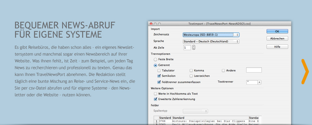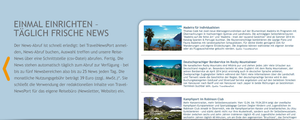 Die Redaktion von TravelNewsPort stellt täglich Reise- und Service-News im System ein, die über eine Schnittstelle (csv-Datei) abgerufen und für eigene Systeme – den Newsletter oder die Website – genutzt werden können. Bis zu fünf News-Abrufe können angelegt werden, pro Abruf werden bis zu fünf aktuelle News übertragen. Für die Nutzung der redaktionellen Inhalte von TravelNewsPort schließen Sie einen Nutzungsvertrag ab. Der Nutzungsvertrag gilt pro Reisebüro. Eine Weitergabe oder externe Weiterverwendung des Contents ist ausgeschlossen.
