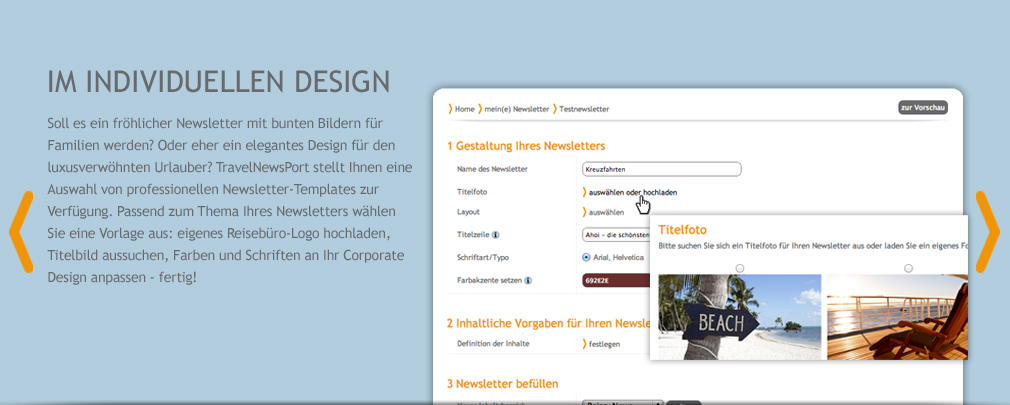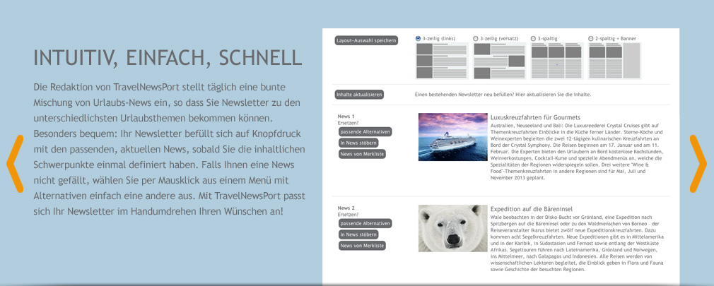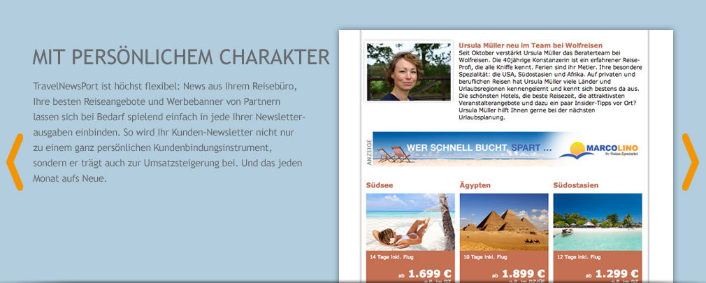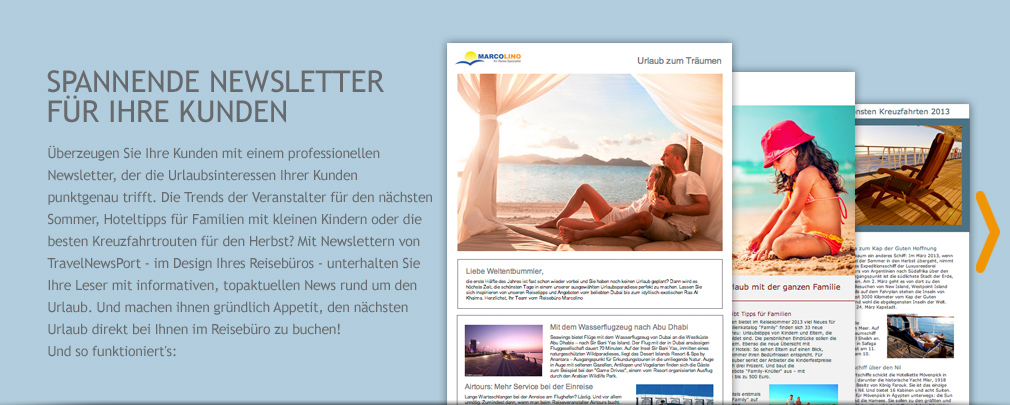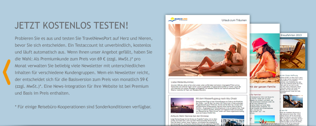 TravelNewsPort stellt die Inhalte (Reisenews) und Portal-Funktionalitäten zur Verfügung, mit denen Reisebüros Newsletter für ihre Kunden generieren können. Für die Nutzung von TravelNewsPort - dem Newsletterportal für Reisebüros - schließen Sie einen Nutzungsvertrag ab: